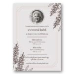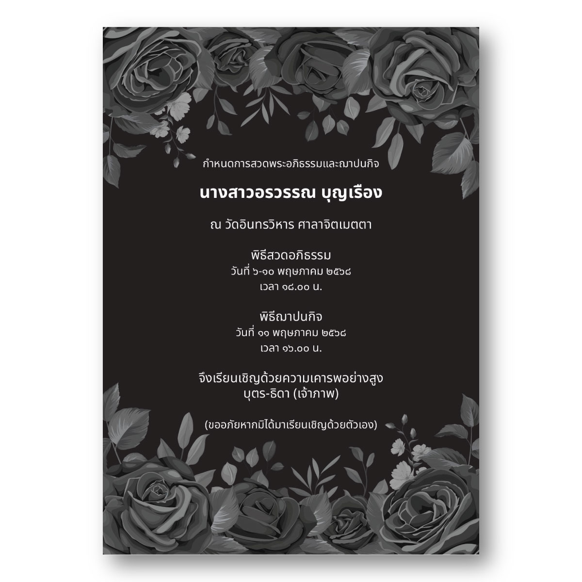 การ์ดเชิญงานศพในรูปแบบดิจิทัล (E-Card) ออกแบบอย่างประณีต เรียบหรู สื่อถึงความอาลัยและให้เกียรติผู้วายชนม์อย่างเหมาะสม ออกแบบโดยมืออาชีพ ใช้โทนสีสุภาพ พร้อมจัดวางองค์ประกอบอย่างมีสไตล์ เพื่อให้การเชิญแขกในงานพิธีเป็นไปอย่างสุภาพและน่าประทับใจ
