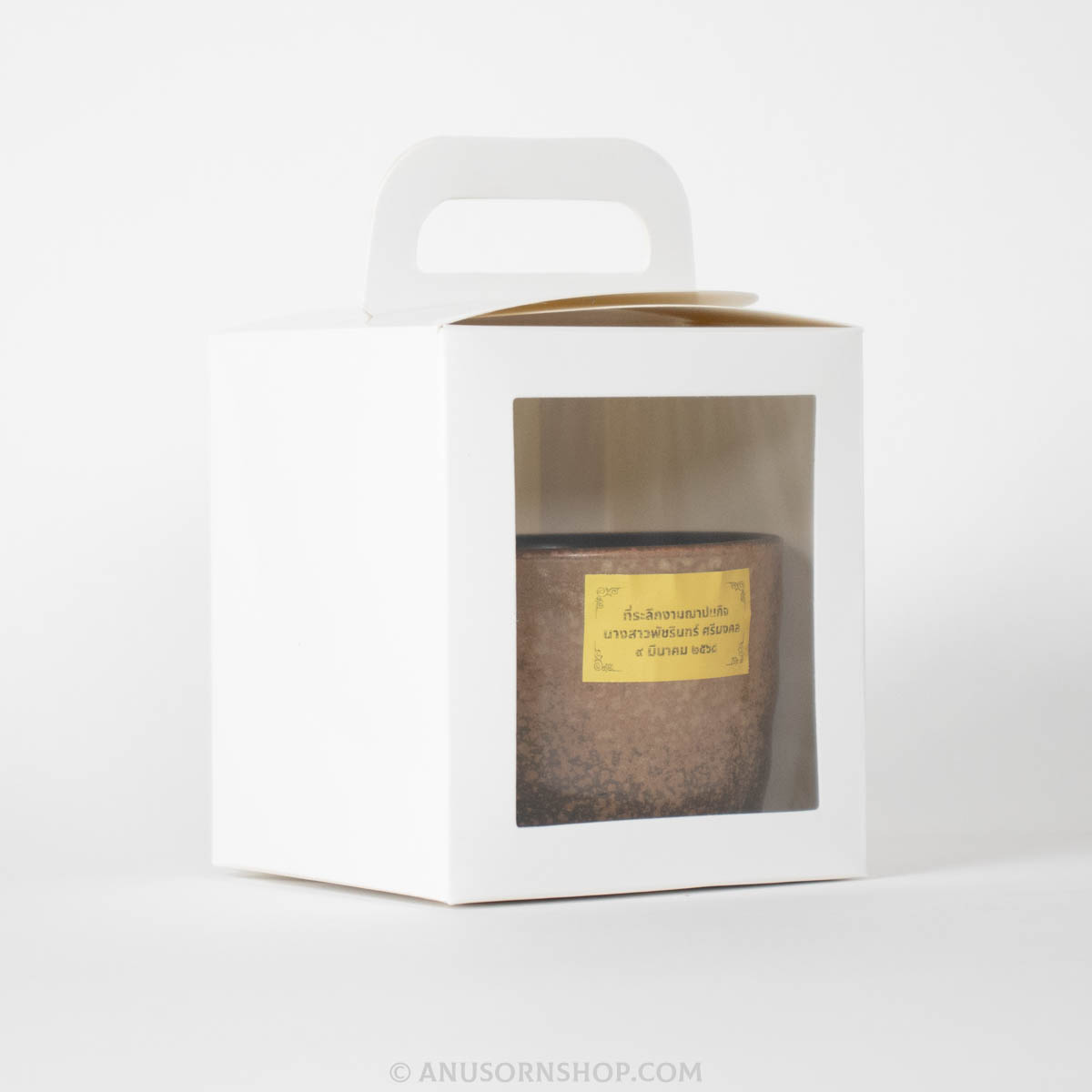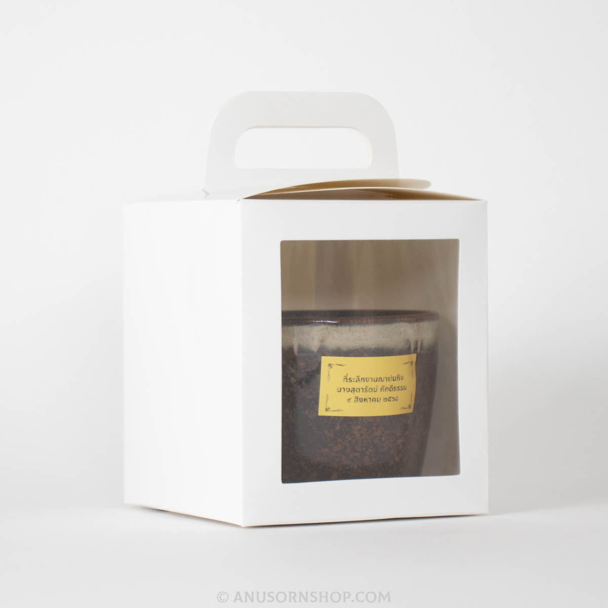 สินค้าในชุดประกอบด้วย: แก้วเซรามิกสีดำ, กล่องบรรจุมีหูหิ้ว และสติกเกอร์ระบุชื่อผู้ล่วงลับและวันจัดงาน
